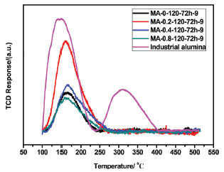 NH3-TPD and ICP-OES analysis The NH3-TPD patterns of the samples synthesized under different templating agent dosages are shown in Figure 7. The desorption peaks of NH3 appear in each sample at 150 °C, whereas industrial alumina also exhibits an NH3 desorption peak at 300 °C. The desorption peak of NH3 formerly adsorbed at weakly acidic site appears at about 150 °C, while the NH3 desorption from moderately acidic sites as seen around 300 °C. The peak areas represent the amount of alkali present. As seen in the figure, as the amount of templating agent increases, the amount of acid in the sample increases at first and then decreases; moreover, industrial alumina has more acid than prepared alumina. However, from the ICP-OES test results (Table 1), the content of Si in the sample increases with the increase in the amount of template, therefore the silicon content has little effect on the acidity of the sample.
