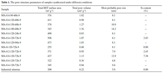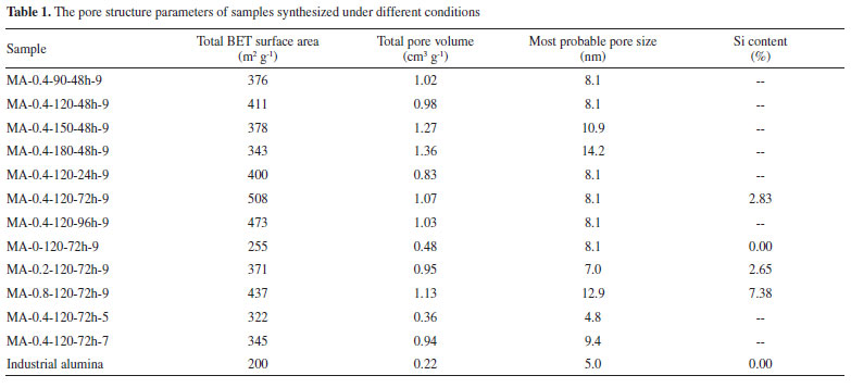 RESULTS AND DISCUSSION Nitrogen adsorption-desorption analysis The influences of hydrothermal conditions The nitrogen adsorption-desorption isotherms and corresponding pore-size distribution curves at different hydrothermal temperatures are shown in the Figure 2a. All samples exhibit the classical shape of type IV isotherms with H3-type hysteresis loops slightly shifting to H2-type; this H2-type of hysteresis loop indicates the presence of slit-shape pores in the macro range.33,34 It can be seen that at higher the capillary condensation step shift to higher relative pressure hydrothermal temperatures as result of wider aperture distributions. This may be because the interaction between the template and the aluminum source is accelerated at high temperature. The more the templating agent is combined with the aluminum source, the larger the space occupied by it, resulting in a larger pore size. However, excessive combination leads to agglomeration and disorder in the pore channel, there by broadening the pore size distribution becomes wider.35 It is found by comparison and analysis that sample MA-12048h-9 shows a rather narrow pore size distribution. The structural parameters of the pores are as given in Table1 and show that when the hydrothermal temperature is 120 °C, the specific surface area is also relatively large. In summary, a hydrothermal temperature of 120 °C is appropriate for preparing mesoporous alumina.