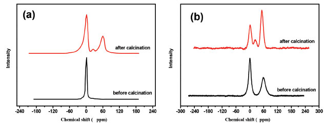 27Al-NMR analysis 27Al-NMR spectrum analysis on the samples were performed before and after calcination of the samples, and with or without the addition a templating agent in order to understand the coordination state of aluminum in the sample. As shown in Figure 5, when no template is added (Figure 5a) and before calcination, the sample only shows a resonance peak near the chemical shift (δ) of 0, and the peak near δ = 0 is assigned to the six-coordinate aluminum resonance peak. After calcination, the sample has three resonance peaks near the chemical shifts (δ) of 0, 30, 60, corresponding to six-coordinate aluminum, five-coordinate aluminum and four-coordinate aluminum, respectively.42-44 Also, the amount of six-coordinate aluminum is greater than the amount of four-coordinate aluminum. After adding the templating agent (Figure 5b), and before the calcination, the sample has two resonance peaks near the chemical shifts (δ) of 0 and 60. After calcination, the sample still has peaks near the chemical shifts (δ) of 0, 30, 60, but the the conclusion is that the sample with the added templating agent difference is that the amount of four-coordinate aluminum is more has more tetra-coordinated aluminum than the sample without than the six-coordinate aluminum. Comparing the two figures, the templating agent, both before and after calcination. It can also be concluded that the excess tetra-coordinated aluminum is derived from the templating agent and the aluminum source. The tetradentate framework aluminum is formed by the connection, so it is believed that in the process of synthesizing mesoporous alumina with KH560-540 as a template, the siloxy- groups in the templating agent combine with the aluminum oxy- group produced by the hydrolysis of the aluminum source to form Si-O-Al bond; the resonance peak of the tetracoordinated aluminum is partially derived from the characteristic peak formed by the Al(OSi) boud of the Al atom.