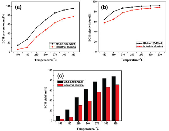 Figure 8. Effect of the reaction temperature on the DCH conversion(a), ECH selectivity(b), ECH yield(c) over MA -0.4-120-72h-9 and industrial alumina. DCH= dichlorohydrin, ECH = epichlorophydrin
