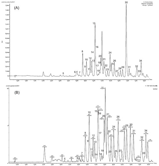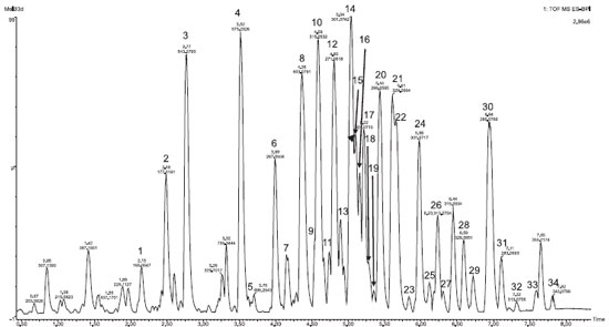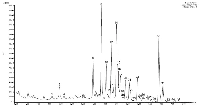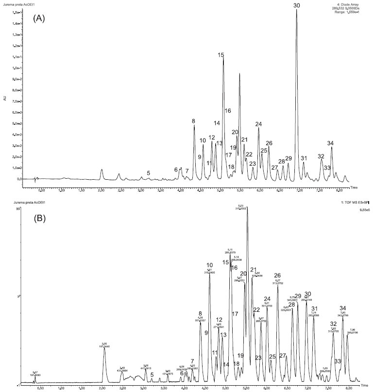 Uma vez que a análise melissopalinológica mostrou uma maior porcentagem de pólens coletados da espécie Mimosa tenuiflora (Tabela 1) com o indicativo que as abelhas visitaram esta espécie vegetal com maior frequência, as flores de Mimosa tenuiflora (jurema preta) foram coletadas para extração e análise por UPLC-DADqTOF-MS/MS e os cromatogramas estão na Figura 4.As análises dos cromatogramas mostraram que todos os flavonoides (compostos 5-34) presentes nos méis de abelha branca são os principais constituintes das flores da jurema preta, ou seja, em relação a esses compostos tanto os méis como a flor de jurema preta apresentam o mesmo perfil químico. Esses dados reforçam que os méis analisados apresentam a maior constituição do néctar coletado das flores desta espécie vegetal como mostrado na analise palinológica. Mais uma vez os dados obtidos neste trabalho mostram o forrageamento específico das abelhas nativas em espécies vegetais também nativas da caatinga brasileira,13 indicando que os meliponíneos não apenas interferem nos aspectos sociais e econômicos, mas também em processos ecológicos e no ecossistema. Nesse sentido, existe a necessidade de preservação para a manutenção da diversidade vegetal e da flora nativa aumentando os sítios de nidificação para as abelhas sem ferrão e manutenção do equilíbrio na região semiárida do Nordeste.