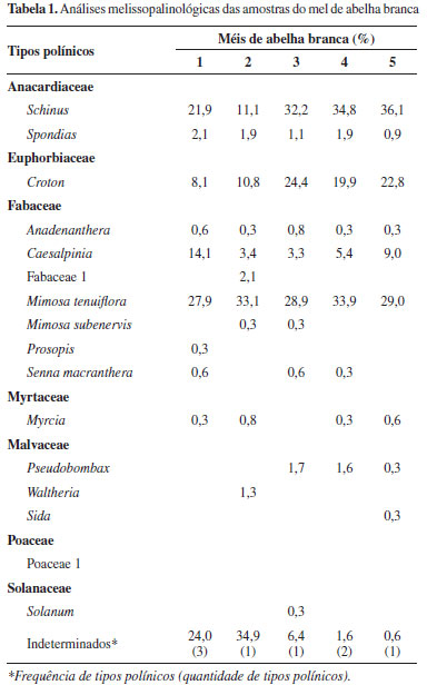 RESULTADOS E DISCUSSÃO Análises melissopalinológicas O grão de pólen apresenta parede externa quimicamente estável e morfologicamente variada, o que permite, através da análise palinológica das cargas de pólen coletadas pelas abelhas, a identificação dos diversos tipos polínicos constituintes, verificação dos períodos de produção e a determinação da origem botânica e geográfica das amostras.18 A análise palinológica das cinco amostras de méis analisadas (Tabela 1) mostrou a predominância de dois principais tipos polínicos, um relativo a plantas do gênero Schinus sp (Anacardeaceae), com variação de 11 a 36%, e outro de Mimosa tenuiflora (Fabaceae), com variação de 29 a 34%, sendo classificado, portanto, como heterofloral (Tabela 1). O pólen apícola ou meliponícola só é considerado monofloral quando apresenta predominância com mais de 45% de uma determinada espécie vegetal.