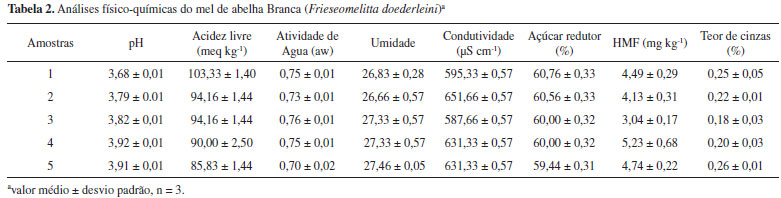 Estudo realizado por Teixeira et al.19 mostrou que espécies de Frieseomelitta sp apresentam padrão de forrageio semelhante ao observado para outros grupos de abelhas eussociais, visitando diversas espécies vegetais, mas concentrando a visita em poucas espécies. Foi observado que essas abelhas visitam espécies da família Caesalpiniaceae em áreas da caatinga nos estados da Bahia e Paraíba. Espécies vegetais pertencentes a esta família são importantes fontes de néctar e pólen. Da mesma forma, espécies vegetais das famílias Malpighiaceae e Anacardiaceae abundantes na região são bastante visitadas pelas abelhas F. doederleini.19 Essas observações podem ser vistas na Tabela 1, em que se verifica que espécies vegetais destas famílias foram visitadas pela abelha branca. Análises físico-químicas As amostras dos méis de abelha branca mostrou aspecto viscoso, coloração marrom escura, sabor de "mel melaço de cana de açúcar" e aromático. O resultado das análises físico-químicas do mel de abelha branca estão apresentados na Tabela 2. Os valores de pH variaram de 3,68 a 3,92 quando comparado com os valores reportados para os méis de abelhas nativas do estado de São Paulo.6 Os valores de pH baixo dos méis inibe a presença e crescimento de micro-organismos. Esse parâmetro é muito importante para o armazenamento e influencia na estabilidade durante a estocagem do mel podendo estar diretamente relacionado com a composição florística nas áreas de coleta, além das diferenças na composição do solo ou associação com outras espécies vegetais.20