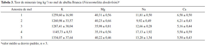 Os valores da acidez variaram entre 85,83 e 103,33 50 meq kg-1 (Tabela 2), sendo acima de 50 meq kg-1 que é o permitido para abelhas sem ferrão. A variação pode ser devido a vários fatores, incluindo o armazenamento das amostras antes das análises, variação dos ácidos orgânicos causada pelas diferentes fontes de néctar, ação das bactérias durante a maturação do mel, quantidade de minerais presentes, entre outros parâmetros não identificados. A acidez pode ser um indicativo de fermentação de açúcares em ácidos orgânicos.21 Os valores da atividade de água para as cinco amostras dos méis variaram de 0,70 a 0,76 (Tabela 2), estando dentro das normas publicadas para os méis das abelhas nativas, que é de 0,80.6 Para umidade os valores foram de 26 e 27%, permitidos para o mel in natura (mel extraído dos potes e mantido sob refrigeração logo após a sua coleta até o momento do consumo, não submetido a qualquer outro processamento), pasteurizado (mel que após a extração passa por processo térmico de pasteurização para redução e/ou inibição do desenvolvimento microbiológico e/ou da atividade enzimática no produto, sendo posteriormente mantido à temperatura ambiente ou sob refrigeração) ou maturado (mel que após a extração passa pelo processo de maturação em temperatura ambiente, caracterizado por sua fermentação natural, a partir do desenvolvimento das leveduras osmofílicas naturalmente presentes) de abelhas nativas que é no máximo 40 g 100 g-1.6 O teor de umidade resulta em um mel menos viscoso, sendo uma característica única para os méis das abelhas nativas. A quantidade de água no mel de meliponíneos é considerada o grande diferencial deste produto em relação ao mel de Apis mellifera.22 A atividade de água é um parâmetro importante para avaliar o estado e a estabilidade relativa, no que diz respeito às propriedades físicas de qualquer alimento, velocidade das reações de alteração e atividade enzimática, assim como crescimento e desenvolvimento de microrganismos.23 A análise da condutividade das amostras mostrou valores que variaram de 587,66 a 651,66 µS cm-1 (Tabela 2). A condutividade elétrica do mel está diretamente relacionada com a origem floral e depende da concentração dos sais minerais, ácidos orgânicos, proteínas e outras substâncias.24,25 De acordo com Yadata,25 os méis escuros apresentam maiores valores para a condutividade elétrica, indicando a presença de ácidos e compostos ionizáveis em solução aquosa. Os valores médios obtidos para os açúcares redutores (frutose e glicose) foram de 59,44 a 60,76/100 g, estando de acordo com os recomendados pela legislação (limite mínimo de 60/100 g). Méis de meliponas possuem menor teor de açúcares (70%), sendo mais adocicados.26 O teor de hidroxifurfural (HMF) dos méis analisados apresentaram valores bem abaixo do permitido (até 20 mg kg-1 de mel) de 3,04 a 5,23 mg kg-1 (Tabela 2). A avaliação de HMF é um parâmetro para verificação do frescor e ou/superaquecimento do mel. O teor de cinzas nas amostras analisadas variou de 0,18 a 0,26% (Tabela 2) e está de acordo com a legislação vigente (máximo de 0,6%). O teor de cinzas representa a riqueza dos minerais no mel, sendo um parâmetro que é frequentemente utilizado para fins de controle de qualidade. O conteúdo mineral no mel é geralmente pequeno e depende da composição do néctar das espécies vegetais, tipo de solo e está associado a diferentes origens botânicas e geográficas.27 Com exceção da acidez, todos os parâmetros físico-químicos para as cinco amostras dos méis de abelha branca apresentaram-se normais de acordo com os dados registrados na literatura e nas legislações para os méis das abelhas nativas sem ferrão. Teor de minerais nos méis de abelha branca O teor dos minerais (Na, K, Ca e Mg) encontrados nos méis de abelha branca estão na Tabela 3. É verificado que o mineral mais abundante é o K seguido do Mg. A composição mineral do mel varia de acordo com a origem floral, clima, solo e fatores relativos às abelhas. Em méis das abelhas Melipona fasciculata e Melipona flavoneata foi verificado que o mineral mais abundante foi o K, seguido do Na, Ca e Mg.28 Para amostras de méis monoflorais e heteroflorais coletados pelas abelhas Apis melifera no estado do Ceará, região Nordeste do Brasil foi verificado que entre os minerais detectados nas amostras de méis analisadas, K apresentou a maior concentração seguido por Ca, Na, e Mg.29 O conteúdo mineral é frequentemente expresso em macro e microelementos e sua composição é dependente de condições intrínsecas (origem botânica) e extrínsecas (solo, origem geográfica). Esses bioelementos estão presentes em amostras de meis, estando entre os principais macronutrientes K, Ca, Mg e Na e micronutrientes Fe, Cu, Zn, Mn e Se.29,30 Os minerais são essenciais para regulação das vias metabólicas e processos fisiológicos. Sua ingestão adequada é fundamental para manter a homeostase, proteção celular, funcionalidade e saúde, enquanto a sua deficiência pode desencadear doenças específicas. De acordo com a regulamentação brasileira31 para minerais, a contribuição de mais de 30% da IDR (ingestão diária recomendada) de referência por 100 g de produto, classifica o alimento como "alto conteúdo" e acima de 15% como "fonte". Com base na IDR, somente o potássio presente nas amostras dos méis de abelha branca pode ser considerado como "fonte" desse mineral.