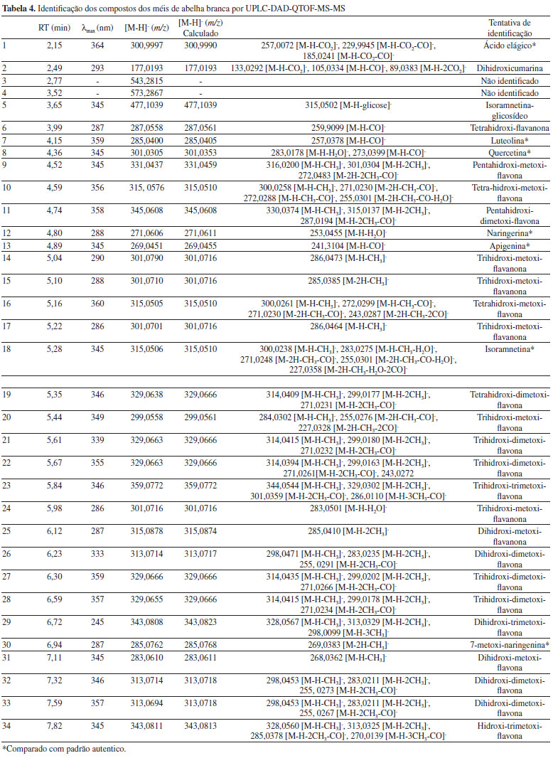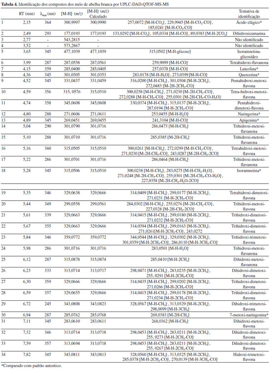 Análises por UPLC-PDA-qTOF-MS/MS Alguns compostos conhecidos presentes no mel de abelha branca foram identificados por comparação com padrões autênticos de acordo com os tempos de retenção, dados de ultravioleta (UV) e espectros de massas. Os compostos não conhecidos foram caracterizados pela análise dos íons produtos (espectros MSE) e pelos espectros de UV comparados com registros na literatura. Dos 34 compostos analisados nas amostras de méis, trinta e dois deles foram identificados (Tabela 4), desses, os compostos 1, 7, 8, 12, 13 e 30 foram comparados com padrões autênticos. Com exceção dos compostos 3 e 4 (não foi possível a identificação somente com os espectros de massas) todos são derivados fenólicos. Apenas três compostos não são flavonoides agliconas: 1 (ácido elágico), 2 (dihidroxicumarina) e 5 (isoramnetina-glicosídeo). Dos 29 flavonóides agliconas identificados 21 são flavonas/flavonois e 8 são flavanonas/flavanonois. Os cromatogramas obtidos por UPLC-DAD e ion pico base (UPLC-qTOF/MSE) em modo negativo da fração SPE metanólica do mel de abelha branca (amostra 3) estão nas Figuras 1 e 2, respectivamente.