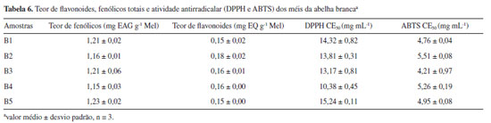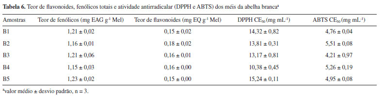 Teor de flavonoides, fenólicos totais e atividade antirradicalar (DPPD e ABTS) dos méis da abelha branca (Frieseomelitta doederleini) Os resultados das análises teor de flavonoides, fenólicos totais e atividades antirradicalares frente aos radicais DPPD eABTS dos méis da abelha branca estão na Tabela 6. Os testes foram realizados com as amostras de mel in natura. O teor de compostos fenólicos variou de 1,15-1,23 miligramas equivalente ao ácido gálico por grama do mel (mgGAE g-1). Este resultado é similar aos valores encontrados para os méis in natura da abelha sem ferrão Melipona subnitida.8 O teor de flavonoides variou de 0,15-0,18 miligramas equivalente a quercetina por cada grama de mel (mg EQ g-1 de mel).