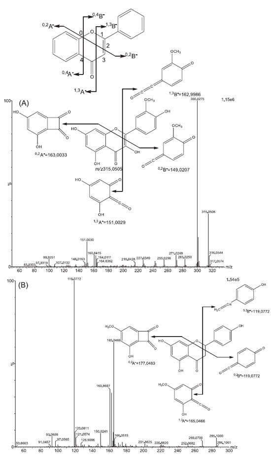 O pico 1 mostrou o íon [M-H]- em m/z 300.9997 e foi identificado como ácido elágico. Os íons produtos em m/z 283.9943 [M-H2O]−, m/z 257.0072 [M-H-CO2]−, m/z 229.9945 [M-H-CO2-CO]−, m/z 201.0184 [M-H-CO2-2CO]−, and m/z 185.0241 [M-H-2CO2CO]-corroboram com a identificação.32 O pico 2 apresentou o íon [M-H]-em m/z 177,0193 [M-H]-. Os íons produtos em m/z 133, 0292 e 89,0383 são referentes à perda de CO2 e em m/z 105,0334 é devido a perda de CO. Esses dados sugerem que o composto 2 pode ser uma cumarina dihidroxilada.33 Os compostos 3 e 4 não foram identificados com os dados obtidos pelos espectros de massas e não apresentam absorção no UV. Composto 5 (isoramnetina-glicosídeo) com m/z 477,2039 [M-H]-mostrou a perda de 162 Da, sugerindo a presença de uma hexose na estrutura. O fragmento em m/z 315.0502 [M-H-hexose]-corresponde a molécula da isoramnetina (quercetina metilada) desprotonada. Os flavonoides agliconas foram separadas em dois grupos baseados nos valores das absorções no UV (em torno de 290 nm para flavanona/flavanonol e 345-360 nm para flavona/flavonol) e nos íons produtos obtidos nos espectros de massas, sendo a grande maioria isômeros como: 7, 30 (285 Da); 8, 14, 15, 17, 24 (301 da); 10, 16, 18, 25 (315 Da); 11, 19 (345 Da); 21, 22, 27, 28 (329 Da); 26, 32, 33 (313 Da) e 29, 34 (343 Da). Os picos mais comuns derivados da perda neutra de pequenas moléculas ou íons como por exemplo CO (28 Da), H2O (18 Da) ou CH3 (15 Da) estão na Tabela 4. Geralmente a presença dos íons produtos resultantes da perda dessas moléculas com baixa intensidade e a presença acentuada do pico do íon desprotonado é observado no espectro MSE obtido com a mais baixa energia de colisão. No mesmo tipo de análise MSE utilizando-se uma rampa com maior energia de colisão que varia de 10 a 30 V, a abundância relativa dos íons produtos que geram moléculas neutras é aumentada, como também aparecem outros fragmentos resultantes da quebra do anel C dos flavonoides, clivagem retro Diels-Alder (RDA), pois com o aumento da energia de colisão, ocorre uma completa fragmentação a partir da molécula desprotonada. A clivagem RDA resulta em fragmentos que revelam o padrão de substituição nos anéis A e B. Os íons produtos são denominados i,jA- e i,jB-, A e B representam os anéis e os números sobrescritos indicam a quebra das ligações a partir das moléculas desprotonadas.34,35 Desse modo, os fragmentos representativos das clivagens das ligações 0,2 e 1,3 do anel C em RDA são 0,2A-, 0,2B-e 1,3A-, 1,3B-, respectivamente. A quebra através da retrociclização do anel C que representa as duas classes dos flavonoides está na Figura 3 e os íons produtos (MS2) obtidos para todos os flavonoides identificados estão na Tabela 5. Os fragmentos obtidos resultantes do anel A e B indicam um possível padrão de substituição nestes anéis relativo ao número de hidroxilas e metoxilas presentes, embora não possa indicar a posição exata destes grupos no anel. Um exemplo para as duas classes de flavonoides detectados está na Figura 3, na qual são mostrados os principais íons produtos para a isoramnetina e 7-metoxi-naringenina, respectivamente. Isoramnetina representa um flavonol que apresenta o íon desprotonado em m/z 315,0506 [M-H]-. O espectro de massas mostra a perda de metila em m/z 300,0285 [M-H-CH3]-, perda de água 283,0275 [M-2H-CH3-H2O]- e subsequentes perdas de CO m/z 271,0248 [M-2H-CH3-CO]-, 255,0310 [M-2H-CH3-H2O-CO]-e m/z 227,0358 [M-2H-CH3-H2O-2CO]-. De acordo com Huck et al.,36 as flavonas metoxiladas primeiro perdem a metila [M-H-CH3]-, depois ocorre desidratação [M-2H-CH3-H2O]-e perda de carbonila. A clivagem do anel C referente a RDA forneceu os íons produtos em m/z 164,0111, m/z 149,9961, m/z 151,0025 referentes aos fragmentos 0,2A-, e 1,3A-, respectivamente. O íon produto em m/z 164,0111 demonstra que a metoxila está ligada no anel B da isoramnetina. Os flavonoides semelhantes à isoramnetina apresentaram perfil de ionização similares (Tabela 4). A 7-metoxi-naringenina, representante de uma flavanona, apresentou o pico do íon desprotonado em m/z 285,0762 [M-H]-. Os principais íons produtos formados foram m/z 269,0383 [M-2H-CH3]-e m/z 252,0089 [M-2H-CH3-H2O]-, além dos íons referentes a RDA em m/z 165,0467 (0,2A-) e m/z 119,0494 (0,2B-). Mais uma vez a presença da metoxila na posição 7 do anel A foi confirmada pelo pico referente a 0,2A-de m/z 165,0467 (Figura 3). Os picos dos íons produtos obtidos de todas as outras flavanonas ou flavanonois estão nas Tabelas 4 e 5.