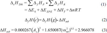The isodesmic reactions were used to predict the heat of formation (HOF) of compounds, and isodesmic reactions of N14 and N18 are shown in Figures 2 and 3. The enthalpy of reaction (∆rH298) at 298 K can be calculated according to Equation (1) in the isodesmic reaction. The ∆fHP and ∆fHR of the following equation are the HOFs of products and the reactants, respectively. Similarly, ∆E0, ∆EZPE, and ∆HT are the differences between products and reactants. Furthermore, the E0 is the total energy at 0 K and the ∆HT is the thermal correction from 0 K to 298 K. The EZPE is zero-point energy, which means the difference between the lowest possible energy that a quantum mechanical system may have, and the classical minimum energy of the system. According to Equation (1), the heat of formation of the gaseous N14 and N18 ∆fH(g) can be calculated, while the heat of formation in the condensed phase ∆fH(c) is determined by Equation (2). In order to estimate ∆Hsub, the electrostatic potential method23 can be used, as shown in Equation (3). In the equation (3) and (4), As is molecular surface area. And σ2tot is total variance on the molecular surface, which is the sum of positive and negative parts and reflects the variability of molecular electrostatic potentials. The ν is electrostatic balance parameter, and the value of νσ2tot indicates that a molecule has relatively strong tendencies to interact with others of its own kind electrostatically. Finally, these parameters can be calculated by Multiwfn software.22 ![]() In the high energy density material, the crystal density (ρ) is an important parameter for predicting performance. Equation (4) proposed by Politzer et al.24 was used to calculate the crystal density of compounds where M is the molecular weight and Vm is the molecular volume defined as the inside of a contour of 0.001 au density that was evaluated using Monte Carlo integration. Finally, α, β, and γ here are 0.9183, 0.0028, and 0.0443, respectively. ![]() Detonation pressure (P, GPa), detonation velocity (D, km s-1), and heat of detonation (Q, cal g-1) reflecting the explosive performance of energetic materials, were estimated using EXPLO 5 (v6.01). The frontier molecular orbitals include the lowest unoccupied molecular orbital (LUMO) and the highest occupied molecular orbital (HOMO). Long-range corrected hybrid functionals (ωB97X-D) are considered to be more accurate than global hybrid functionals (B3LYP) when predicting the energy gap,25 while the two methods were used in the paper to illustrate the fact well. Impact sensitivity is an important index to evaluate explosives, and h50% is a common value to assess the index. The h50% is the height where 50% probability of the "drop" results in a reaction of the sample. The shorter the drop height is, the greater the impact sensitivity is. The value is difficult to measure experimentally and strongly depend on morphology, crystal shape and size and impurities. Predicting it with any reliability is even more difficult, but Equation (5) can estimate it approximately. In the equation, α2, β2, and γ2 are −0.0064, 241.42, and −3.43, respectively.26