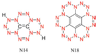 I. School of Materials Science & Engineering, Beijing Institute of Technology, 100081 Beijing - PR, China Recebido em 10/02/2019 *e-mail: liyuchuan@bit.edu.cn The power of a compound is enhanced by the direct connection of nitrogen atoms, and its stability can be improved through conjugated structure. So novel high energy density materials N14 (1,6-dihydro-1,2,3,3a,4,5,5a,6,7,8,8a,9,10,10a-tetradecazapyrene) and N18 (1,2,2a,3,4,4a,5,6,6a,7,8,8a,9,10,10a,11,12a-octadecazacoronene) were designed, and their structures, detonation performance, and stabilities were calculated employing density functional theory (DFT). The detonation performance includes detonation pressure (P), detonation velocity (D), and heat of detonation (Q). Furthermore, the stability involves frontier molecular orbitals and impact sensitivity. Calculations reveal that they have an excellent power, detonation performance of N14 (P = 43.6 GPa, D = 10040 m s-1, Q = 2214 cal g-1) and N18 (P = 37.4 GPa, D = 9400 m s-1, Q = 2114 cal g-1) are comparable to CL-20. Besides, their impact sensitivities are slightly better than CL-20, therefore they are promising candidates in energetic materials. INTRODUCTION High energy density materials (HEDMs), which possess not only perfect detonation performance, but also good thermal stability and low sensitivity, have attracted considerable interest for some potential applications in propellants, explosives, and pyrotechnic agents in recent years.1-3 In order to meet the main requirements in safety and power, much effort has been made by a large number of research groups.4-7 However, in most cases, it is very difficult to concentrate both desired properties into one substance. Traditional energetic materials (HMX, RDX, CL20, etc.) are developing toward a bottleneck stage. Polynitrogen materials have received much more attention on their high energy content due to the deviation of bond energy of the N2 triple bond and N-N single bonds or double bonds.8 However, most of them are unstable. Since 1999, a series of N5 +-containing salts have been investigated and the most stable N5 +-containing salt N5 +SbF6 - is only stable at about 60 °C.7 In 2004, polymeric nitrogen with a cubic gauche structure was produced by Eremets.9 Its power is five times greater than that of the most powerfully energetic materials, whereas it disappears at ambient pressure. In 2017, two significant breakthroughs in the bulk synthesis and characterization of the pentazolate anion cyclo-N5 - salts were achieved by Lu and Hu, respectively.5,10 Recently, the most stable cyclo-N5 - salts, Na24N60 and Na20N60, occur only below 148 °C.11 Additionally, some other all-nitrogen materials cannot exist under room temperature for a long period.8,12 New high energy density materials are considered under the circumstances. Two novel covalent compounds, N14 and N18, are designed in this paper with the characteristics of great power and high safety, whose chemical structures are shown in Figure 1. There are 14 nitrogen atoms closely linked in N14, and 18 nitrogen atoms in N18. In these structures, several nitrogen atoms connected directly can enhance energy. However, in most cases, high nitrogen content and stability tend to be mutually exclusive.4 Thereby olefin and benzene ring are expected to form a large π bond with nitrogen atoms to improve its stability, though the large conjugated bonds do not appear. The C12N12 structure, being similar to N18, was reported, and Mondal13 indicates that is slightly aromatic in nature, but Tursungul14 does not agree with him.