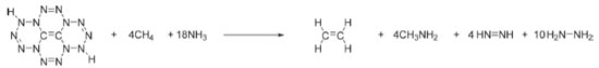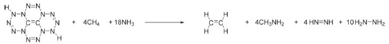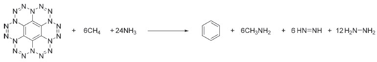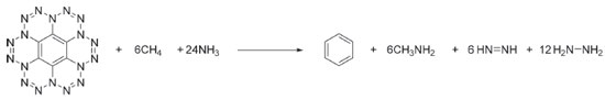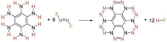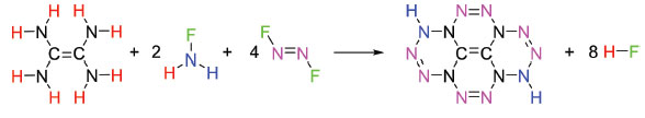 SYNTHETIC ROUTES It is well known33,34 that the N-F bond is weak to break, and then hydrogen fluoride is eliminated. Based on that, polynitrogen material N5+ was synthesized.8 The same method is also used to produce the title compounds and two possible routes were proposed in Figure 9 and 10. In the two schemes, tetraaminoethylenes,35 hexaaminobenzene,36 monofluoroamin,37 and 1,2-difluorodiazine38 are obtained in accordance with previous papers.