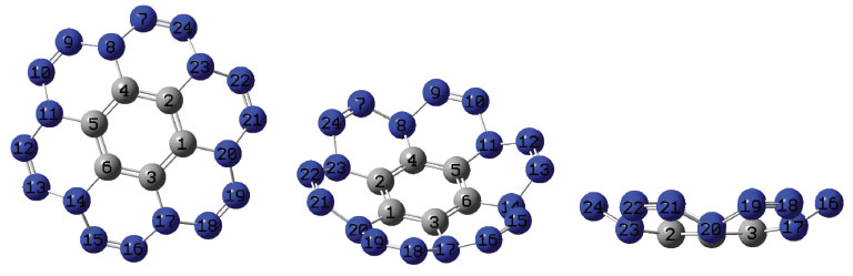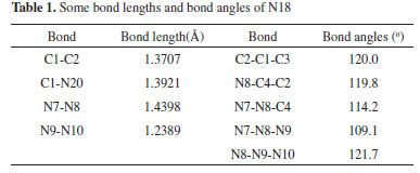 RESULTS AND DISCUSSION Geometrical structures The structure of N18 is similar to that of coronene, with periphery nitrogen atoms replacing carbon atoms. Some of periphery nitrogen atoms form double bonds while some form single bonds, and the middle carbon forms the benzene ring. We hope that the nitrogen atoms with single bonds, which carry lone-pair electrons, form larger conjugated systems with the benzene ring and a large number of azo bonds. However, the output result of the B3LYP method shows that all atoms are not coplanar, so N18 may be not an aromatic compound. The structure output of N18 is shown in Figure 4. Six carbon atoms of the benzene ring form large π bonds in the input structure, but they are linked together with double bonds in the output structure. This is not corrected for the sake of keeping the raw data. More information on standard orientation of every atom was presented in Supporting Information in detail. In this structure, all carbon atoms are in the same plane and each C-C bond length is 1.3707 Å, which is shorter than that of benzene (1.3945 Å). All of the double-bond nitrogen atoms are also in the same plane and the distance of the N-N double bond (each one is 1.2389 Å) is shorter than that of azobenzene (1.2522 Å). Similarly, six single-bond nitrogen atoms are placed on the same plane while the N-N single bond of the compound (1.4398 Å) is close to that of hydrazine (1.4310 Å) and C-N single bonds of the compound (1.3921 Å) are shorter than C-NO2 of TATB (1.4366 Å). The bond lengths of the mentioned benzene, azobenzene, hydrazine, and TATB are calculated using the same method with N18. In this structure, C2-C1-C3 = 120.0°, N8-C4-C2 = 119.8°, N7-N8-C4 = 114.2°, N7-N8-N9 = 109.1°, and N8-N9-N10 = 121.7°. Since N18 has a symmetrical structure, other bond angles have the same value and all bond angles are approximately 108°. Therefore, single-bond nitrogen atoms, double-bond nitrogen atoms, and carbon atoms are not on the same plane and form a large conjugated system, but they have special interactions to become a stable structure. Some bond lengths and bond angles of N18 are listed in Table 1.