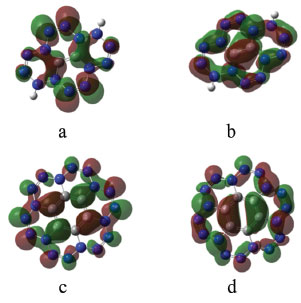 ![]() Figure 6. LUMO (a) and HOMO (b) orbitals of N14; and LUMO (c) and HOMO (d) orbitals of N18