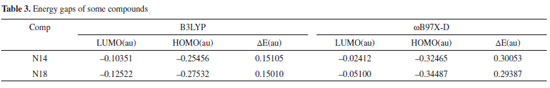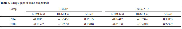 Frontier molecular orbitals The LUMO (a) and HOMO (b) orbits of N14 and N18 are show in Figure 6. The positive phase is red and the negative one is green. Either LUMO or HOMO doesn't locate on H atom of N14, and the two orbits locate approximately on all the atoms of N18. Energy gaps of two compounds were calculated with B3LYP and ωB97X-D listed in Table 3. The values of ∆ELUMO-HOMO are small, but it only reflects photochemistry stability. Natural bond orbital (NBO) analysis is an essential tool for studying interactions among bonds, and the orbital charges are summarized in the Supporting Information.
