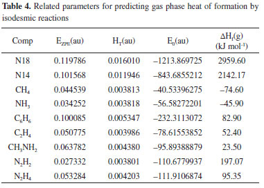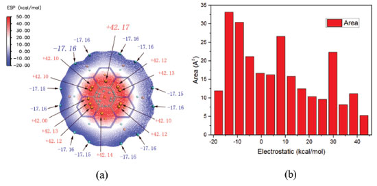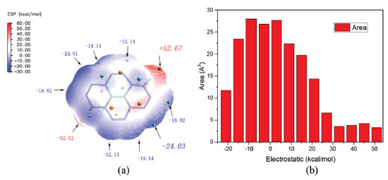 Electrostatic potentials The electrostatic potential map of the molecular surface (a) and the surface areas in each ESP range (b) of N14 are plotted and shown in Figure 7. The surface minima of ESP is distributed near some N atoms due to these atoms with double bonds or lone-pair electron, which are the primary electrophilic sites. The global minima site of ESP is present near the N3 atom, with the value -24.03 kcal mol-1. The global maxima site of ESP is +52.67 kcal mol-1, which is close to that of the H18 atom since nitrogen atoms attract a lot of electrons. However, it may not be easily attacked by the nucleophile since H18, with the maxima in a monomer, and N, with surface minima in neighboring monomer product hydrogen bond, will result in the electrostatic potentials cancelling each other out. The same applies to H17, with the other global maxima site at +52.62 kcal mol-1. From Figure 7(b), it can be seen that a large portion has a small ESP value from -25 to +25 kcal mol-1. The negative part mainly corresponds to the surface above and below the several N atoms with the effect of the abundant lone-pair electron or π-electron cloud. The largest positive area mainly arises from the C-C double bond, and the smaller ones with remarkable positive ESP values correspond to the C-H bond, though these are not nucleophilic sites. The electrostatic potential map of the molecular surface (a) and the surface areas in each ESP range (b) of N18 is plotted and shown in Figure 8. The surface minima of ESP are distributed in the peripheral of the N-atom ring and their values range from -17.15 to -17.16 kcal mol-1, which is close to global minima. The N25 is near the global minima site, with the value -17.16 kcal mol-1. Just like the minima, the surface maxima ranges from +42.00 to +42.14 kcal mol-1 , which is close to the global maxima +42.17 kcal mol-1. They are located on the periphery of the benzene ring and on the same side as the global minima site. It can be seen that positive and negative potentials are distributed more evenly over the surface. There is a large portion ESP distributing from -20 to +30 kcal mol-1, as shown in Figure 8(b). Obviously, the positive part arises from the N atom and the negative one comes from the C atom. Heats of formation The gas phase heat of formation of N14 and N18 can be calculated according to Figure 2, 3 and Equation (1). The experimental gas phase heat of formation of NH3, CH4, C6H6, CH3NH2, N2H2, and N2H4 are available.27 They are all shown in Table 4 and the gas phase heat of formation of N14 and N18 are 2142.17 and 2959.60 kJ mol-1, respectively. Due to the great deal of nitrogen atoms that are connected directly, their enthalpy of formation is much higher than RDX, HMX, or CL-20,18 as shown in Table 7.