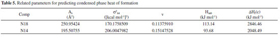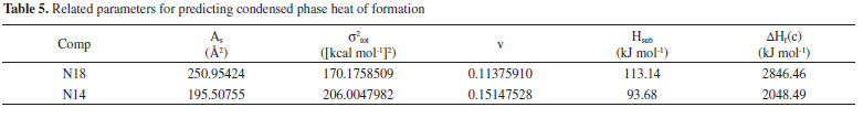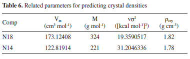 The heat of formation in the condensed phase of N14 and N18 can be calculated according to Equations (2) and (3), and they are 2048.49 and 2846.46 kJ mol-1, respectively. Related parameters are shown in Table 5. Crystal densities The crystal densities of N14 and N18 can be calculated according to Equation (4), and they are 1.784 and 1.817 g cm-3. Related parameters are shown in Table 6. As these two compounds contain mainly C and N, and do not contain O, and their densities are lower than HMX and CL-20, as shown in Table 7. The density of nitrogen-rich compounds without oxygen atoms is generally low. For instance, the density value of hydrogen azide (HN3) and 5-amino1H-tetrazole is 1.12 and 1.71 g cm-3 respectively.27 When it comes to traditional CHON materials, their heats derive from redox reaction and the density is an important parameter to power.28 But compounds mentioned in title are more like polynitrogen compounds, their heats derive from the deviation of bond energy of each nitrogen atom.8 Therefore, the density is not the primary focus. Detonation performance The detonation velocity (D), detonation pressure (P), and heat of detonation (Q) of N14 and N18 are computed based on their crystal densities (ρ) and condensed phase heats of formation ∆fH(c). Their detonation performance, including RDX, HMX, and CL-20,29 are shown in Table 7. It is surprised that crystal density and heat of formation of N14 is lower than that of N18, but the detonation performance of the former is greater than that of the latter. Because the number mole of gaseous detonation products per gram of explosive plays a key role in detonation performance here. This resullt also reveals that detonation performance of N14 (Q = 2214 cal g-1 and D = 10,040 m s-1) and N18 (Q = 2114 cal g-1 and D = 9400 m s-1) are higher than that of CL-20, while their detonation pressures (43.6 GPa and 37.4 GPa) are lower. The title compounds can decompose into large amount of nitrogen gas, which contributes to their detonation performance. Nitrogen-rich molecules are thus designed to promising materials. Fox example, dinitropyrazole fused 1,2,3,4-tetrazine has a performance (D=9631 m s-1, P=44.0 GPa) comparable to CL-20.30 Impact sensitivity The values (cm) of h50% are estimated through the method and the results are summarized in Table 8. The calculated sensitivity of CL-20 is 9 cm, closing to measured value.16 The values of title compounds are 23 and 32 cm respectively, and higher than CL-20. Therefore, the N14 and N18 are more insensitivity than CL-20. Compounds in which many nitrogen atoms are directly connected are all sensitive to impact, and a common example is lead azide.31 But when these nitrogen atoms constitute a fused ring, the sensitivity will be improved.30,32
