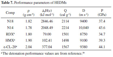 CONCLUSIONS In this work, N14 and N18 are calculated by the Gaussian 09 package with the B3LYP method with the 6-311++G (d, p) basis set to investigate their detonation performance and stability. The results show that the detonation performance of N14 (P = 43.6 GPa, D = 10,040 m s-1, Q = 2214 cal g-1) and N18 (P = 37.4 GPa, D = 9400 m s-1, Q = 2114 cal g-1) are comparable to the value of CL-20. All the atoms in the two compounds may form a special conjugated system although they are non-coplanar, and this requires further discussion. Considering both the detonation properties and relative stabilities, they are all likely to be used as candidates of high energy density materials with modest impact sensitivity and high performance, and these results can also be used for comparisons with properties of other familiar explosives, and provide theoretical support for the molecular design of novel high energetic density compounds. Further work on route optimization and practical synthesis is being carried out by our team.