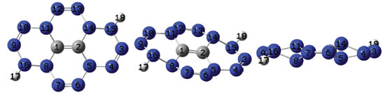 The structure of N14 is similar to that of pyrene, with periphery nitrogen atoms replacing carbons atoms. Moreover, it possesses two additional hydrogen atoms because nitrogen has three valence bonds. We hope that the nitrogen atoms with single bonds, which carry lone-pair electrons, form a larger conjugated system with the C-C double bond and many azo bonds. Just like N18, the output result with the B3LYP method shows that all atoms are not coplanar, so N14 may not be an aromatic compound. The structure output of N14 is shown in Figure 5. In the structure of N14, the C-C double bond has a bond length of 1.3122 Å, which is shorter than that of ethylene (1.3288 Å). The distance between N3-N4 and N9-N10 is 1.2523 Å, while that of N6-N7 and N12-N13 is 1.2324 Å, and they are close to their counterpart of azobenzene. Two C-N bond lengths are 1.3922 and 1.3921 Å, respectively, which are shorter than C-NO2 of TATB. The N-H bond length is 1.0151 Å, which is close to that of NH3 (1.0147 Å), calculated with same method and basis set. All N-N single bond lengths of N14 are listed in Table 2. Some of them are shorter than that of hydrazine, and some of them are slightly longer, but close to it. In the structure of N14, some bond angles are also listed in Table 2 and other bond angles have the same value for the symmetrical structure. From the table, it can be seen that all bond angles are close to 108°. As in the situation with N18, not all atoms in N14 are on the same plane and form a large conjugated system, but they have special interactions to become a stable structure. More information on output result of N14 was presented in Supporting Information in detail.