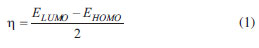 As estruturas otimizadas foram obtidas em fase gasosa por meio de cálculos de DFT, utilizando o funcional B3LYP.18,19 O conjunto de bases LanL2DZ foi empregado,20 o qual aplica um pseudopotencial no átomo de zinco e utiliza a base D95V para os demais átomos. O nível B3LYP/LanL2DZ foi empregado em um trabalho anterior envolvendo complexos de Zn2+ com derivados da 8-HQ, apresentando excelentes resultados.21 Todos os cálculos foram realizados no programa Gaussian 09.22 Foram realizados cálculos de frequência nas estruturas otimizadas obtidas, e a ausência de frequências imaginárias nessas estruturas confirmou que essas representaram o mínimo de energia. Os valores de energia obtidos representam a energia eletrônica com a correção de ponto de zero. Os valores de dureza (η) para as estruturas foram obtidos por meio da Eq. 1, conforme proposto por Parr e Pearson,23 em que: ELUMO e EHOMO são as energias dos orbitais de fronteira LUMO e HOMO, respectivamente.