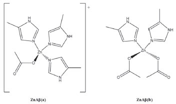 Na estrutura experimental obtida por Zirah e colaboradores, em pH 6,5,11 o Zn2+ é coordenado por três resíduos de histidina e um glutamato, enquanto, no trabalho de Alies e colaboradores, em pH 7,4,10 a coordenação se dá por dois resíduos de histidina, um glutamato e um outro resíduo com terminação carboxilada (Asp1, Glu3 ou Asp7). Em trabalhos teóricos, também são feitas propostas para o sítio ZnAβ, como no trabalho de Marino e colaboradores,24 em que a estrutura mais estável obtida é similar ao sítio ZnAβ de Zirah e olaboradores, com Zn2+ coordenado tetraedricamente por três átomos de nitrogênio (N) de anéis de 4-metil-imidazol e um oxigênio (O) de um grupo acetato. Assim, dois modelos foram utilizados no presente estudo para mimetizar o sítio ZnAβ, um simulando o sítio proposto por Zirah e colaboradores e o outro simulando o sítio proposto por Alies e colaboradores, ZnAβ(a) e ZnAβ(b), respectivamente (Figura 1).