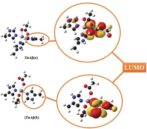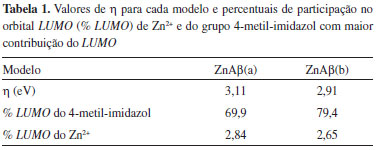 Como se pode observar na Figura 2, o orbital LUMO, em ambos os modelos, possui contribuição majoritária de um dos ligantes, um dos grupos 4-metil-imidazol. Isso indica que, no sítio de coordenação do complexo natural de Aβ com Zn2+, um dos resíduos de histidina possui contribuição majoritária no LUMO. Isso pode ser visualizado de maneira quantitativa quando se observa os valores de percentuais de participação nesse orbital para ambos os modelos (Tabela 1).