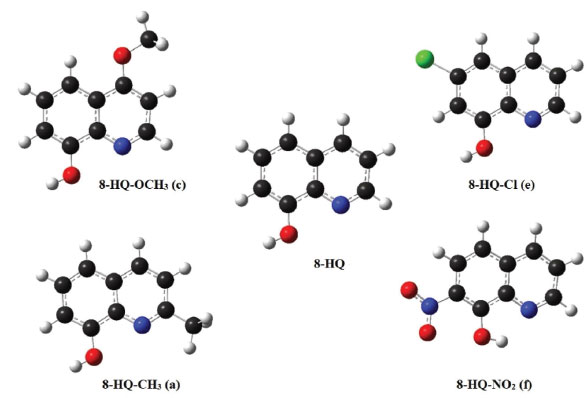 Foram propostos seis modelos para quatro ligantes derivados da 8-HQ, totalizando 25 estruturas (incluindo a 8-HQ). A Figura 3 apresenta as estruturas genéricas para todos os ligantes com o substituintes X.