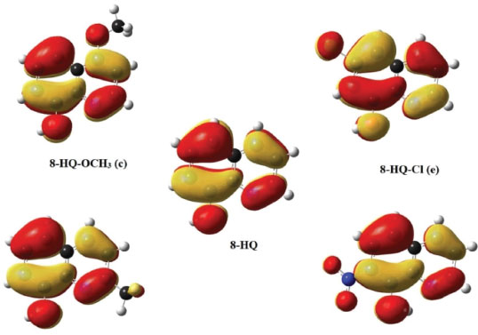 Os orbitais HOMO, para cada ligante, apresentaram caráter predominantemente ligante e perfis bastante semelhantes. Nos átomos de O e N, esse orbital se apresenta como o par de elétrons não ligante desses átomos, que serão responsáveis por coordenar o íon Zn2+. Os percentuais de participação nesse orbital do N e O da 8-HQ foram 8,25 e 15,3, respectivamente, e valores próximos a esses foram obtidos para os demais ligantes. Os valores se encontraram dentro das seguintes faixas: 6,81-8,37% (N) e 14,4-15,2% (O) para 8-HQ-CH3; 5,83-9,50% (N) e 10,3-13,3% (O) para 8-HQ-OCH3; 7,02-8,16% (N) e 13,6-14,9 (O) para 8-HQ-Cl; e 6,66-8,61% (N) e 14,7-16,6% (O) para 8-HQ-NO2. No geral, os ligantes que apresentaram maior contribuição no HOMO na região de coordenação foram os de modelo f.