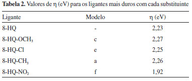 Foram obtidos os valores de η para todos os 25 ligantes deste estudo, que podem ser vistos na Tabela 2S, no Material Suplementar. Uma vez que os valores obtidos foram relativamente próximos para as estruturas com o mesmo substituinte, foram tomados então os ligantes mais duros para cada substituinte para avaliação e comparação com a 8-HQ. A Tabela 2 apresenta os valores de η para os ligantes de maior η para cada substituinte, enquanto suas estruturas otimizadas obtidas são apresentadas na Figura 4.