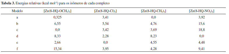 Como se pode observar nas Tabelas 3 e 4, os ligantes de maior dureza com cada substituinte foram aqueles que geraram os complexos mais estáveis, mesmo para o substituinte -NO2, no qual houve a mudança do sítio e da coordenação. Isso está de acordo com o enunciado de Pearson,26 em que quanto mais próxima foi a dureza dos ligantes de cada classe de substituintes da dureza do sítio ZnAβ, maior foi a estabilidade do produto formado.Assim como feito para o ligante 8-HQ-NO2 de modelo f, para os outros dois ligantes com pares de elétrons livres na posição orto ao O (modelo f), ou seja, 8-HQ-OCH3, 8-HQ-Cl, foram obtidas as estruturas otimizadas para complexos de modelo f.1 com esses dois ligantes (Figura 1S, Material Suplementar), entretanto, as estruturas apresentaram energia mais alta do que seus respectivos isômeros. Para [Zn(8-HQ-OCH3)2], o modelo f.1 apresentou 20,1 kcal mol-1 a mais em energia do que o modelo f e também apresentou geometria quadrática plana em torno do íon metálico, mais instável quando comparada à geometria tetraédrica do modelo f. Já para o complexo [Zn(8-HQ-Cl)2], o modelo f.1 apresentou energia superior ao modelo f em 45,8 kcal mol-1, indicando que o átomo de Cl não se coordena ao íon metálico.