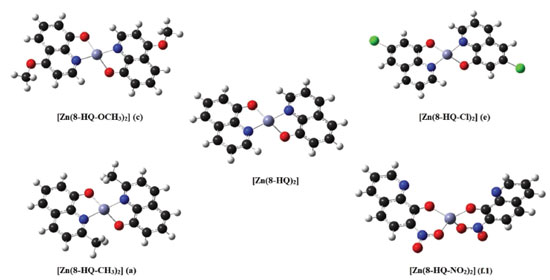 Na Figura 6, em todos os complexos se observou um ambiente tetraédrico em torno do Zn2+, e, com exceção de -NO2, o íon metálico formou um anel de cinco membros com o O e N quinolínicos e os átomos de C diretamente ligados aos átomos quelantes. Já para o -NO2, se observou a formação de um anel de seis membros, mais estável, o que explica o porquê desse modelo ser mais estável do que os modelos d e f para o complexo com o 8-HQ-NO2.