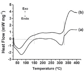 RESULTS AND DISCUSSION Based on the possibility that moderate heating of the silk cocoon could cause some disruptions in the molecular organization of the fibers, the study initially focused on the thermal events that could occur as a result of changes induced by heat treatment. Figure 1 shows the DSC curves for the raw and processed cocoons. At temperatures of 30 to 150 ºC, both curves show an endothermic process characteristic of water vaporization. However, the curve is broadened, probably evidencing a strong interaction between the water molecules and the silk molecules. At temperatures above 326 ºC, an exothermal process related to degradation occurs in both kinds of cocoon. The behavior observed in the DSC curves for raw and processed cocoons is similar to that observed by Malay et al.12 and Wang et al.13 working on the silk fibers of B. mori cocoons.