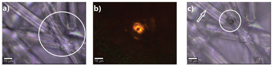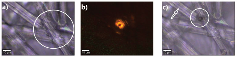 ![]() Figure 2. Optical micrographies of the cocoon surface (a), with laser irradiation at 532 nm (b) and after laser irradiation at 532 nm (c). A confocal microscope was used with a X50 lens