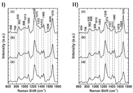 ![]() Figure 3. Raman spectra of the surfaces of I) raw cocoon and II) processed cocoon in the 600-1800 cm-1 region; (a) without heating; (b) oven-dried at 80 ºC; and (c) oven-dried at 125 ºC for 60 minutes, at excitation of 532 nm