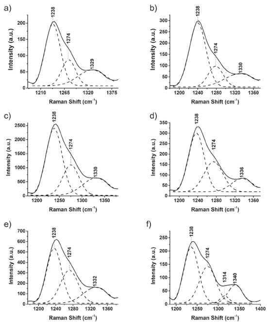 ![]() Figure 4. Deconvoluted Raman spectra at 532 nm in the 1175-1390 cm-1 region for raw cocoon: (a) no heat treatment, (c) oven-dried at 80 ºC, (e) oven-dried at 125 ºC; and for processed cocoon: (b) no heat treatment, (d) oven-dried at 80 ºC, (f) oven-dried at 125 ºC