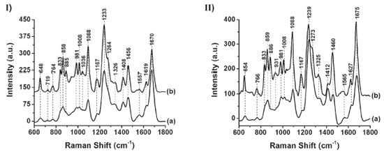 ![]() Figure 5. Raman spectra of raw cocoon I) and processed cocoon II) in the 600-1800 cm-1 region, at (a) 532 and (b) 785 nm