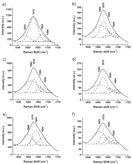 ![]() Figure 6. Deconvoluted Raman spectra at 785 nm in the 1629-1720 cm-1 region for raw cocoon: (a) no heat treatment, (c) oven-dried at 80 ºC, (e) oven-dried at 125 ºC; processed cocoon (b) no heat treatment, (d) oven-dried at 80 ºC, (f) oven-dried at 125 ºC