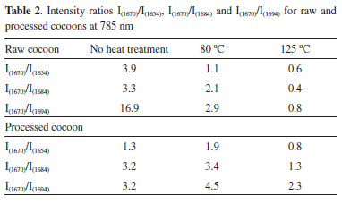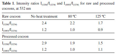 EXPERIMENTAL Materials The cocoons of the silkworm (B. mori) used in this study were supplied by Empresa Bratac de Fiação de Seda, based in Londrina, Paraná State, Brazil. Cocoon classification The cocoon samples were initially classified as raw cocoons, prior to any heat treatment, and processed cocoons, after heat treatment in drying ovens. Raw and processed cocoons were subsequently cut into 0.5 x 0.5 cm pieces using stainless steel scissors. Cocoon oven drying Once the cocoons had been classified, they were subjected to two different drying programs in an oven (FANEN, Modelo 3015 SE), at 80 and 125 ºC for 60 minutes. After cooling to ambient temperature, the samples obtained were designated 'treated raw cocoons' and 'treated processed cocoons. Differential scanning calorimetry (DSC) Differential scanning calorimetry was used on cocoon fragments (total mass of 1,800 mg raw cocoon and 1,600 mg processed cocoon). The samples were placed on hermetic aluminum supports. DSC curves were obtained in a Shimadzu DSC-60 differential scanning calorimeter. Heat was applied at a rate of 10 ºC min-1, over a temperature range of 25 to 300 ºC. A gas flow rate of 50 mL min-1 was used in a nitrogen atmosphere. Spectroscopic characterization For Raman measurements, the silk cocoons were mounted on glass microscope slides with the aid of metal claws. The Raman spectra and Optical micrographies of the inner surfaces of the cocoons were obtained using a WITec® Alpha300+ Confocal Raman Microscope System and x50 ZEISS lens at wavelengths of 532 and 785 nm. The laser power focused on the sample was maintained at 7.5 and 10 mW, respectively, measured initially by a power meter equipment positioned after the objective lens. The spectra were collected accumulating for 3 seconds after 10 scans. All spectral deconvolutions were performed using Origin program (8.0, 2007). A number of components and the generation of a reasonable fit were assumed in the process, where each component demonstrates the dependence of the treatment performed on the sample through the change in observed relative intensity. A Gaussian function was used and control over parameters (positions and bandwidth) was not performed, and small differences in positions and bandwidths were tolerated.