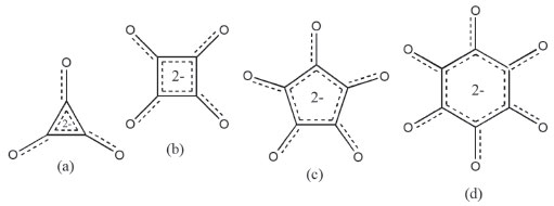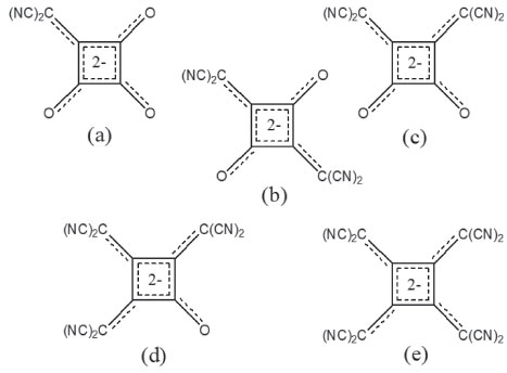 ![]() Figura 1. Representação dos diânions (a) deltato, (b) esquarato, (c) croconato e (d) rodizonato