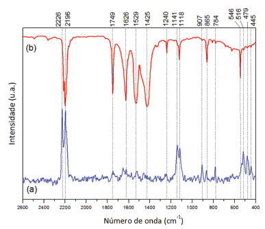 ![]() Figura 4. Espectros (a) Raman e (b) de absorção no infravermelho para o Cis-Na, linha de excitação 1064 nm