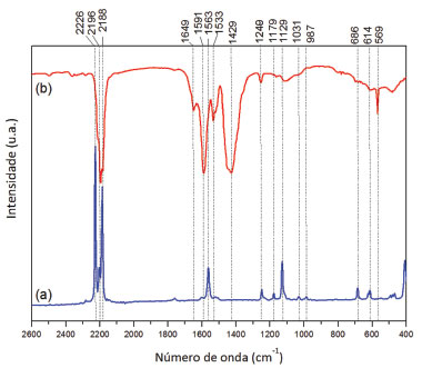 ![]() Figura 5. Espectros (a) Raman e (b) de absorção no infravermelho para o Trans-Na, linha de excitação 1064 nm