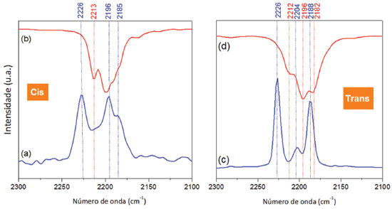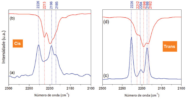 ![]() Figura 6. Espectros (a)/(c) Raman e (b)/(d) de absorção no infravermelho para os ligantes Cis e Trans, respectivamente