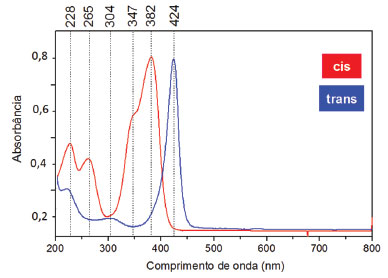 Para o derivado Cis, esse estudo cita que a distribuição de carga elétrica pelas ligações da molécula é nitidamente diferenciada. As médias de distâncias carbono/carbono do anel e as distâncias destes aos grupos C(CN)2 são de 1,422 Å, portanto, relativamente menores que os valores encontrados para a esquaraína Trans. A distância de separação CO - CO (entre as duas carbonilas) no Cis é maior que no Trans (igual a 1,475 Å). Por outro lado, a distância de ligação entre o átomo de carbono do anel e o átomo de carbono do grupo -C(CN)2 demonstra um caráter de dupla ligação significativo. Os espectros eletrônicos para os sais de sódio das esquaraínas Cis e Trans, obtidos em solução aquosa, estão representados na Figura 8. Para o derivado Trans são observadas três transições bem distintas, sendo a primeira com elevada absortividade molar ocorrendo em 424 nm (ε = 2,4.105 mol-1 L cm-1), as demais ocorrem em 304 e em 228 nm. O espectro eletrônico da Cis apresenta três transições bem distintas: o máximo de absorção é observado em 382 nm (ε = 4,2 × 104 mol-1 L cm-1) com um ombro em 347 nm (ε = 3,1 × 104 mol-1 L cm-1), a segunda e terceiras absorções ocorrem em 263 nm (ε = 2,0 × 104 mol-1 L cm-1) e 228 nm (ε = 2,6 × 104 mol-1 L cm-1), respectivamente.