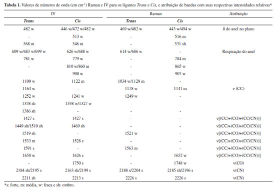Representações vibracionais (diânion livre): Trans - simetria D2h Cis - simetria C2v Assim, tem-se o Cis pertencente ao grupo de ponto C2v e o Trans ao grupo D2h; esperava-se que experimentalmente houvesse um número maior de bandas nos espectros do composto Cis em relação ao composto Trans. A aproximação mencionada e os resultados oriundos da abordagem adotada no cálculo sugerem que peculiaridades espectroscópicas são esperadas para ambos os ligantes. Por exemplo, para o ligante Cis espera-se que haja uma diferença significativa no número de bandas verificadas em seus espectros vibracionais. Além disso, a presença do elemento de simetria inversão verificado no cálculo para o ligante Trans vem sugerir que, experimentalmente, os espectros apresentem bandas ativas em uma técnica vibracional e inativas em outra. Nas Figuras 4, 5 e 6 estão apresentados os espectros vibracionais experimentais para ambos os ligantes (contra íon sódio). Na Tabela 1 estão sumarizados os valores de frequência Raman e IV para os ligantes Trans e Cis, bem como a atribuição de bandas com suas respectivas intensidades relativas.