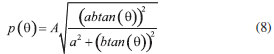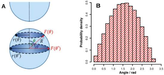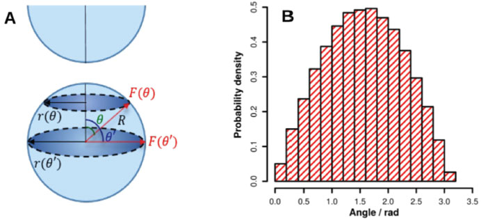 ![]() Figure 3. (A) scheme to sample the probability density distribution for the angles θ. (B) Area nomalized histogram for 106 values of θ according to Eq. 7