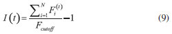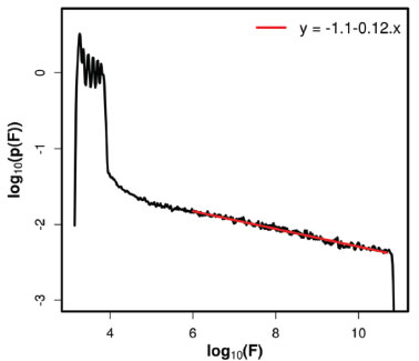 ![]() Figure 4. Dependence of the probability density function, p(F), as function of F for a dimer of 20 nm radius AuNSs. The graph is presented in log-log scale