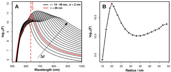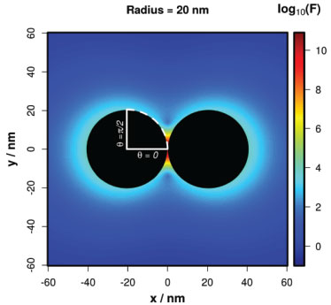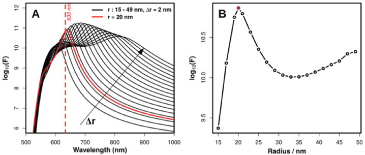 ![]() Figure 1. (A) log10(F) spectra for AuNS dimers for different nanoparticle radius. (B) Dependence of the maximum enhancement factor (measured at the HS center) as function of AuNS radius for a 633 nm wavelength light excitation