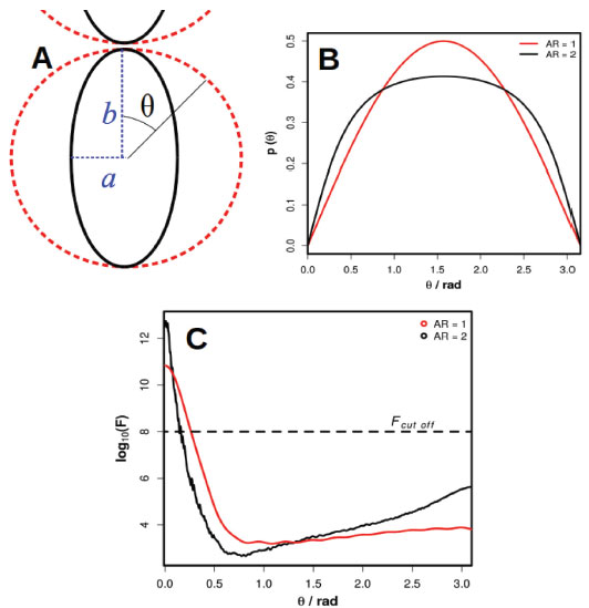 ![]() Figure 5. Comparison between AuNS (red, AR = 1) and AuNE (black, AR = 2) dimers in terms of structure (A), θ probability density distribution (B) and dependence of log10(F) as function of θ (C)