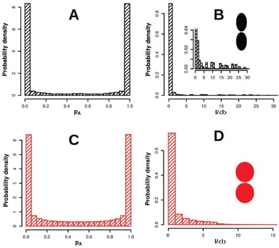 ![]() Figure 6. sm-SERS statistics for AuNE (black, A and B) and AuNS (red, C and D) dimers. The histograms in (A) and (C) show the probability density distributions of the percentage of signal attributed to one of the molecules (pA) in the bi-analyte sm-SERS simulation. The histograms in (B) and (D) show the distributions of SERS intensities normalized by averages (<I>)