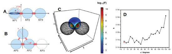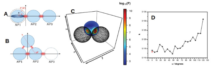 ![]() Figure 7. (A) and (B) show different AuNS trimer configurations. (C) presents a 3D map of F on the surface of a trimer configuration. For simplicity, only the enhancements for one particle are presented. (D) shows the TPD parameter k as function of the trimer configuration, described by the relative angle α (the red point represents the result for the dimer)
