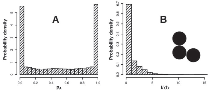 ![]() Figure 8. sm-SERS statistics for AuNS trimers. The histogram in (A) shows the probability density distributions of the percentage of signal attributed to one of the molecules (pA) in the sm-SERS bi-analyte simulations. The histogram in (B) shows the distribution of SERS intensities normalized by the average (<I>)