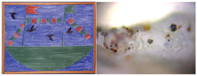 ![]() Figura 1. À esquerda, fotografia da pintura "Barco com bandeirinhas e pássaros" (fotografia de Marília Bovo Lopes, 2019), de Alfredo Volpi (1955). À direita, imagem feita em microscópio óptico com aumento de x200 obtida do material eflorescente coletado